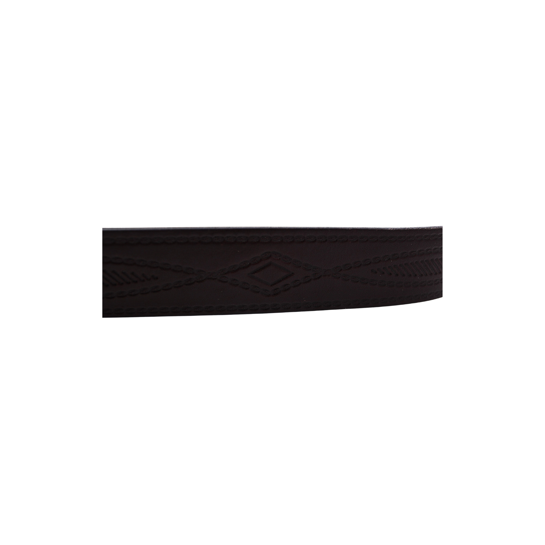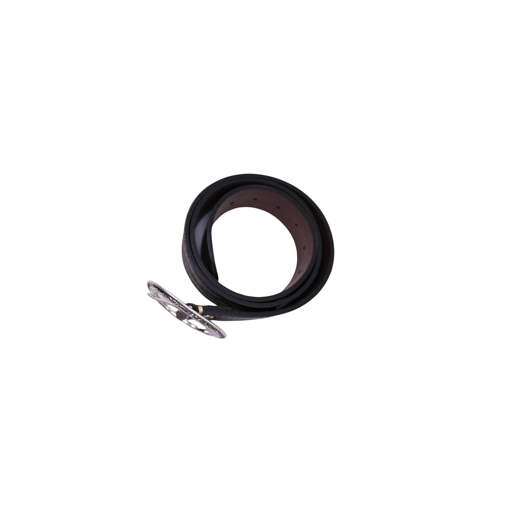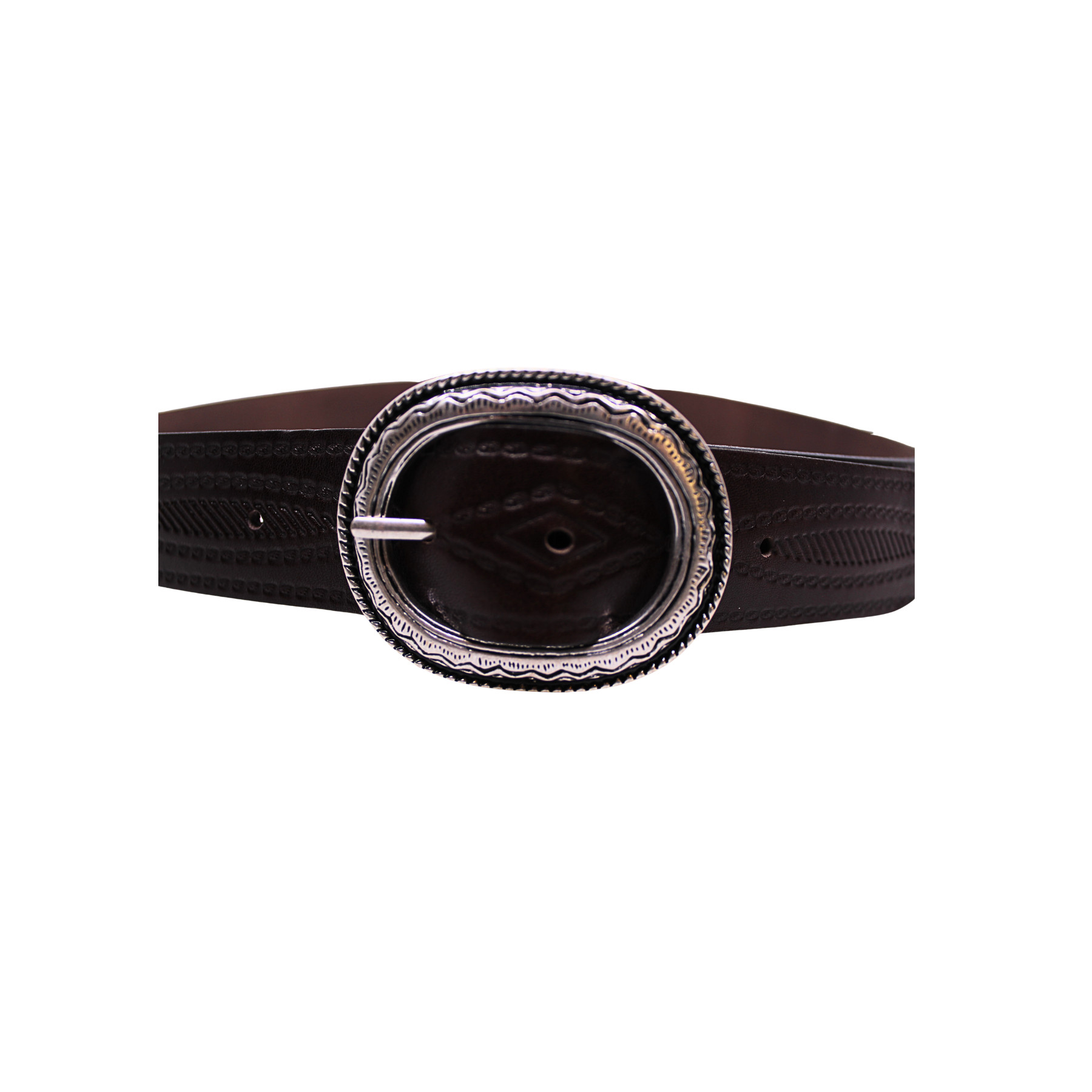 Ceinture en cuir marron foncé, avec boucle ronde décorée, et motif discret gravé tout le long de taille.